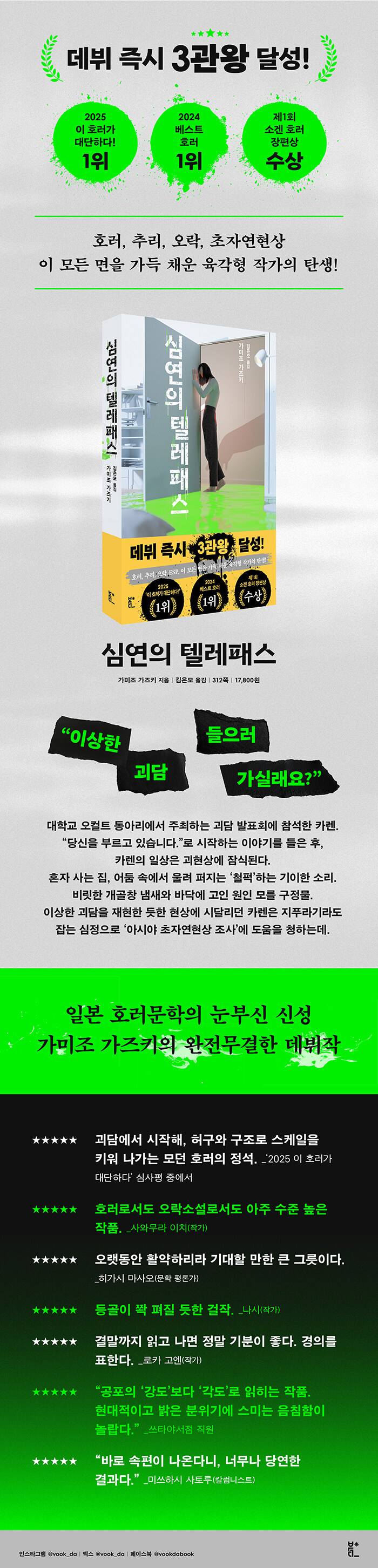 또한 가미조 가즈키는 고전적인 공포와 현대적인 설정을 호러 외에도 추리, 오락, ESP에 이르는 다양한 장르 안에서 균형감 있게 그려나간다. “경찰이 개입하기 어렵게, 사람이 죽거나 미치지 않고 ‘사라진다’는 설정을 잡았다. […] 집필 중 줄곧 염두에 둔 것은 ‘현실적인 공포’로, 실재하는 장소를 무대로 삼은 것도 같은 이유다.”라는 작가의 인터뷰에서도 이 작품이 호러에만 국한되지 않음을 알 수 있다. 머릿속을 맴도는 이상한 괴담, 초자연현상에 대한 관심 여부가 정반대인 콤비의 밝고 경쾌한 티키타카, 초심리학이라는 지극히 현대적인 모티프를 작가는 작품 곳곳에 심어 새로운 포맷의 호러로서 차별성을 증명한다. 괴이의 근원이 돌연 대도시 한가운데서 모습을 드러내는 것도 J-호러의 큰 흐름인 민속학 호러 비틀기로 볼 수 있다. 그리고 결말에서 독자는 왜 작가가 그토록 다양한 장르적 요소를 끌어안아야 했는지 알게 된다. “무작정 공포를 부추기기보다는 순수한 엔터테인먼트를 지향한 소설”이라는 작가의 말처럼 이제 막 호러문학에 첫발을 들이려는 독자는 물론 호러라는 장르에 심취한 독자 역시 만족할 만한 작품이다.