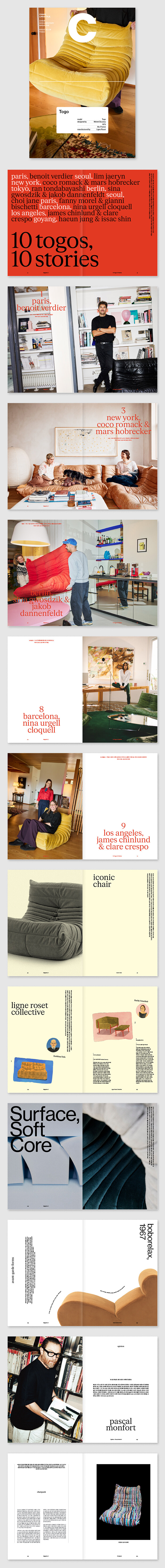 매거진 《C》 8호에서는 패션 브랜드 오너부터 뮤지션, 영화 프로덕션 디자이너, DJ까지 전 세계에서 만난 10개의 집, 10개의 토고 스토리를 소개합니다. 또한 제조사 리네로제의 공장을 방문해 토고의 전 생산 과정을 면밀히 살펴보는 한편, 토고가 탄생한 1970년대가 남긴 과감하고 실험적인 소파 디자인 10가지를 함께 조명합니다. 이 외에도 파리 장식미술박물관 큐레이터가 말하는 대중적 아이콘으로서의 토고, 패션 전문가가 정의하는 토고의 창의성과 실험적 스타일까지 토고를 둘러싼 다양한 시선을 폭넓게 조명합니다.