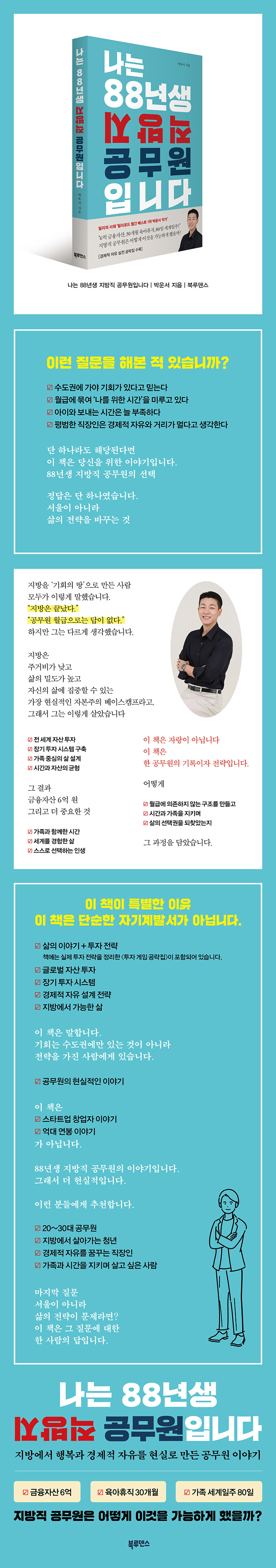『나는 88년생 지방직 공무원입니다』는 이러한 질문에 정면으로 “아니오!”라고 외치는 영주 시청 공무원 박운서의 도전과 성장의 실제 기록이다.
