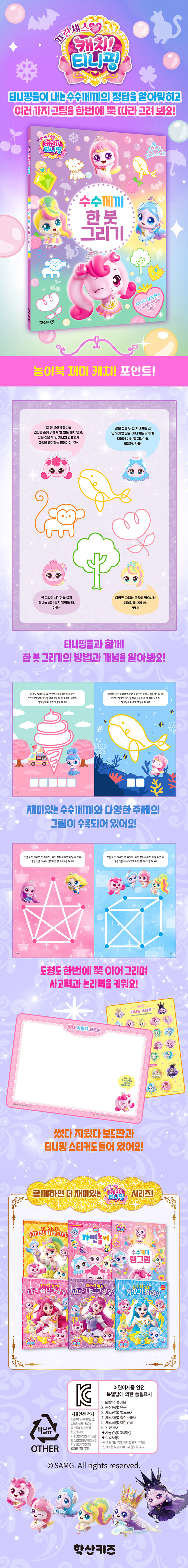 티니핑들이 내는 수수께끼의 정답을 알아맞히고 여러 가지 그림을 한 붓 그리기로 따라 그리는 놀이북이다. 동물, 사물, 음식 등 다양한 주제의 한 붓 그리기를 할 수 있고, 아이들이 좋아하는 티니핑과 함께 놀이하며 자연스럽게 한 붓 그리기의 개념을 익히게 한다. 여러 번 사용할 수 있는 썼다 지웠다 보드판과 티니핑 스티커도 함께 수록했다.