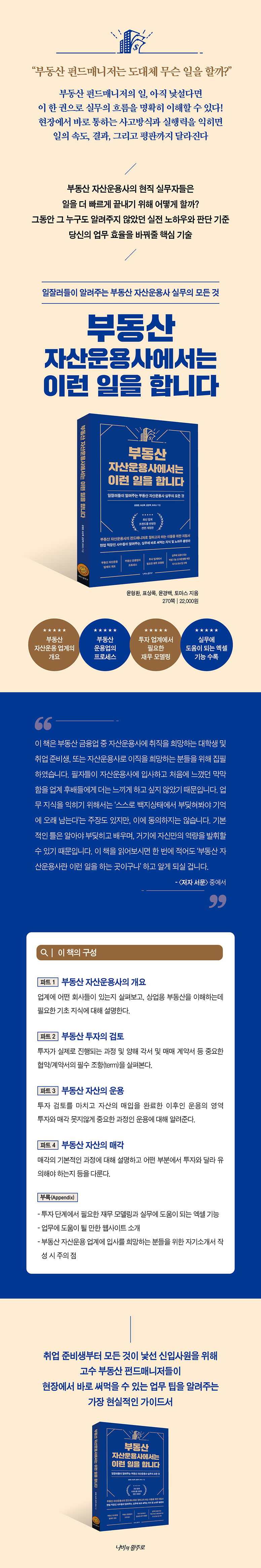이 책은 부동산 금융업 중 자산운용사에 취직을 희망하는 대학생 및 취업 준비생, 또는 자산운용사로 이직을 희망하는 분들을 위해 특별히 출간되었다. 필자들이 자산운용사에 입사하고 처음에 느꼈던 막막함을 업계 후배들에게 더는 느끼게 하고 싶지 않았기 때문이다. 업무 지식을 익히기 위해서는 ‘스스로 백지상태에서 부딪혀봐야 기억에 오래 남는다’는 주장도 있지만, 저자들은 이에 동의하지 않는다. 기본적인 틀은 알아야 부딪히고 배우며, 거기에 더해 자신만의 역량을 발휘하는 것이 훨씬 효율적이라 여긴다. 그래서 그동안 자신들이 몸으로 체득하고 경험한 업무 노하우를 후배들을 위해, 혹은 입사지원을 희망하는 이들을 위해 이 책에서 공개한다.