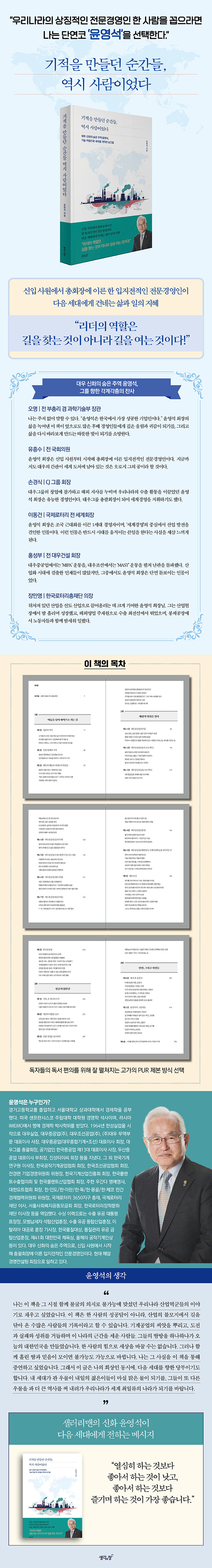 대우그룹 신화를 이끈 전문경영인 윤영석의 삶과 경영 철학을 담은 기록이다. 신입사원에서 총괄회장에 이르기까지의 여정을 통해 한국 산업화의 현장을 증언한다. 한 개인의 성공담을 넘어 산업 발전의 과정을 함께 조망하게 한다.