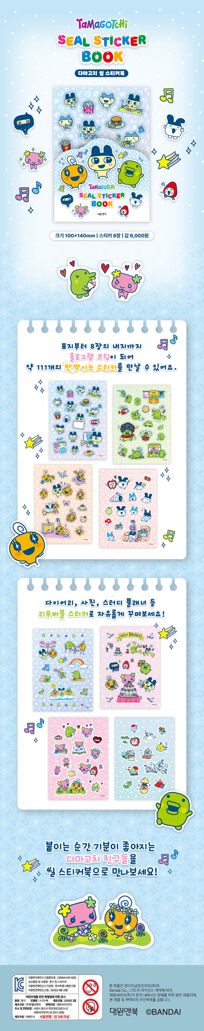 <다마고치 씰 스티커북> 소개<다마고치 씰 스티커북>은 반짝이는 홀로그램과 리무버블 스티커로 즐길 수 있는 굿즈입니다. 다마고치 특유의 귀엽고 개성 넘치는 캐릭터들을 스티커로 만나볼 수 있는 상품입니다.