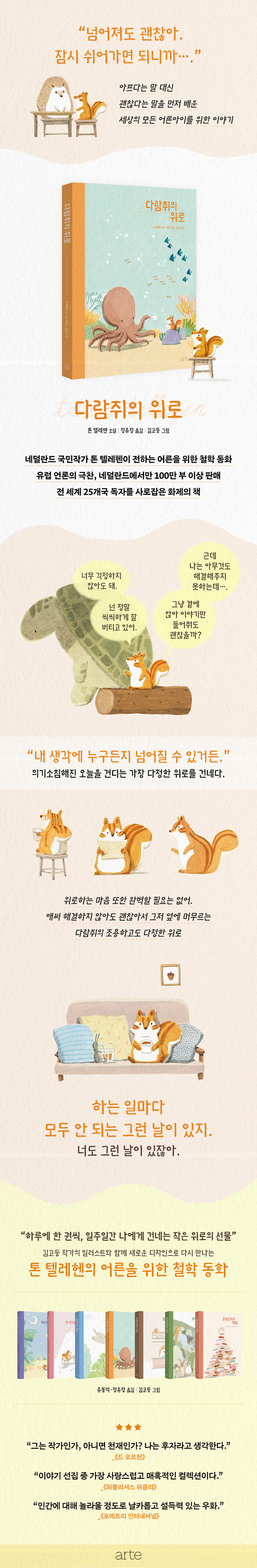 다람쥐가 들려주는 위로와 낙관의 철학 누군가를 초대하고 싶지만 거절당할까 봐 두렵고, 방문을 받으면 부담스럽고, 혼자 있으면 외롭고, 함께 있으면 피곤한 ‘고슴도치’라는 캐릭터를 내세워 인간의 외로움과 관계의 어려움을 유머러스하게 그려내 국내에서 6만 독자들의 사랑을 받았던 베스트셀러 『고슴도치의 소원』 작가이자 네덜란드 국민작가 톤 텔레헨의 『다람쥐의 위로』(원제: Bijna iedereen kon omvallen)가 아르테에서 감성 디자인으로 다시 출간되었다. 전작들이 ‘나’ 자신의 내면의 고독과 감정을 깊이 파고들었다면, 이 책 『다람쥐의 위로』는 한 걸음 더 나아가 타인의 곁에 어떻게 머물 것인지에 대해 이야기한다.