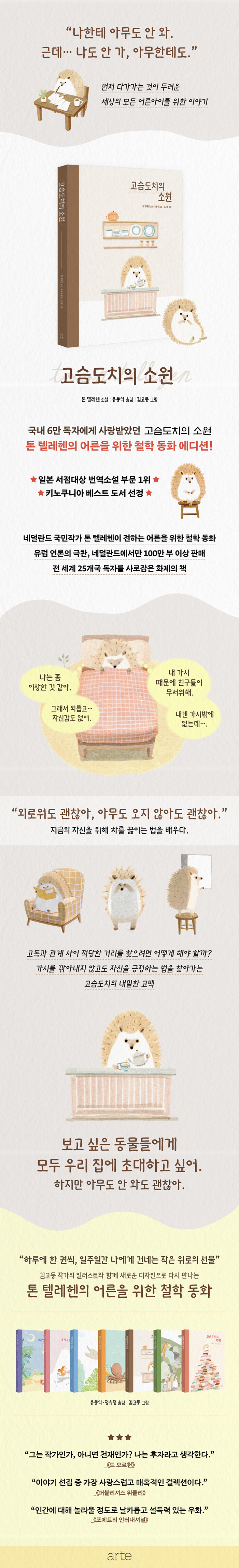 2017년 국내에서 출간된 이래 6만 독자들의 사랑을 받았던 『고슴도치의 소원』(원제: Het verlangen van de egel)이 9년 만에 새로운 디자인으로 단장을 하고 아르테에서 출간되었다. 이 작품은 누군가를 초대하고 싶지만 거절당할까 봐 두렵고, 방문을 받으면 부담스럽고, 혼자 있으면 외롭고, 함께 있으면 피곤한 ‘고슴도치’라는 캐릭터를 통해 “나도 고슴도치인 것 같다”는 독자들의 깊은 공감을 이끌어내며, 외로움을 혼자만의 문제가 아닌 함께 나눌 수 있는 감정으로 확장한 연대의 책으로 자리매김해 왔다. 『고슴도치의 소원』은 모순적인 감정 속에 사는 한 고슴도치의 이야기로 시작된다. 가을이 저물어 가는 어느 날, 창가에 앉아 숲을 바라보던 고슴도치는 “그냥 이유 없이 누군가를 초대해 보면 어떨까” 하고 생각하지만, 곧이어 망설임이 따라온다. 초대장을 보내면 아무도 오지 않을지도 모르고, 누군가 정말 찾아오면 감당할 수 없을지도 모른다. 고슴도치는 편지를 썼다가 지우고, 서랍에 넣었다가 다시 꺼내며 끝없이 고민한다.