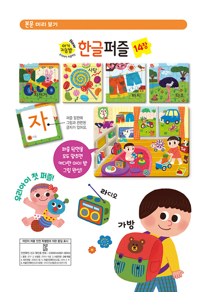 퍼즐식 한글 그림 카드 14장으로 구성되어 있다. 퍼즐의 앞판은 ‘가’로 시작하는 낱말부터 ‘하’로 시작하는 낱말까지 퍼즐 놀이를 하며 한글을 익힐 수 있고, 퍼즐 안쪽에는 그림과 관련된 글자가 있어 반복해서 학습할 수 있다.