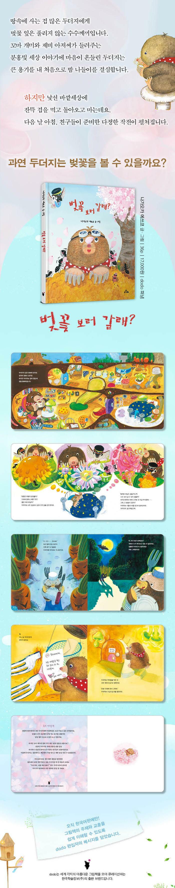땅속 깊은 곳에 사는 겁 많은 두더지에게 벚꽃 잎은 풀리지 않는 수수께끼 같습니다. 이웃인 꼬마 개미와 제비 아저씨가 들려주는 분홍빛 세상과 달콤한 꿀맛은 두더지의 마음을 자꾸만 흔들어 놓지요. 결국 두더지는 큰 용기를 내어 생전 처음 밤 나들이를 결심합니다.