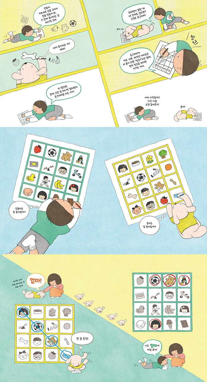 열여섯 칸을 모두 채운 두 친구는 빙고판을 두 팔로 꼭 가린 채 놀이를 시작한다. 동이가 “장난감!”을 외치며 블록 칸에 동그라미를 그리자, 진돌이는 신발 칸에 표시를 한다. 진돌이에게 신발은 곧 장난감이기 때문이다. 그림을 자세히 들여다보면 둘의 차이는 곳곳에서 드러난다. 아이의 곰 인형은 멀쩡하지만, 강아지의 곰 인형은 여기저기 해어져 있고, 아이의 빙고 칸에는 태권도가, 진돌이의 칸에는 뼈다귀가 그려져 있어 소소한 웃음을 자아낸다. 같은 놀이를 하고 있지만, 서로의 ‘좋아함’은 이렇게 조금씩 다르다.