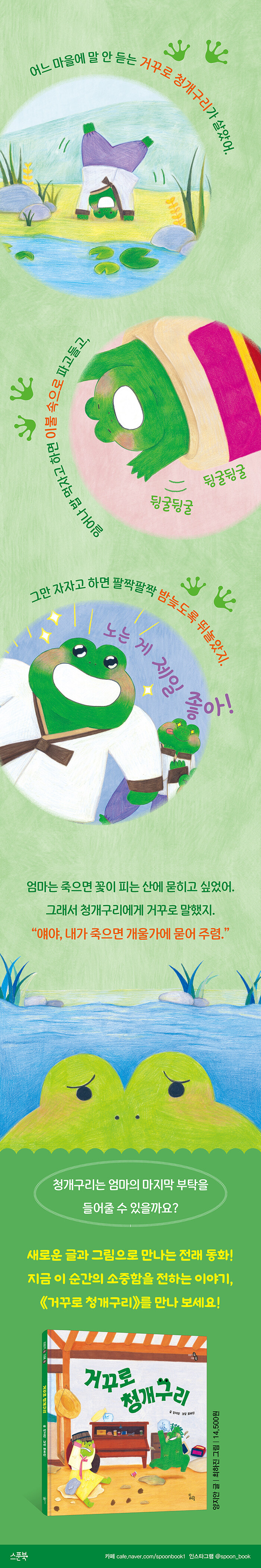 : 전래 동화로 만나는 후회와 반성의 이야기옛이야기 그림책은 이제 막 글을 떼고 책을 읽기 시작하는 어린이들이 만나는 첫 이야기가 되곤 합니다. 영유아 어린이들에게 첫 번째 책 읽기가 긍정적일 수 있도록 도와주어요. 스푼북의 브랜드 ‘하루놀’의 옛이야기 그림책 시리즈 〈이야기 속 지혜 쏙〉에서 전래 동화 ‘청개구리 이야기’를 바탕으로 한 그림책 《거꾸로 청개구리》를 새롭게 선보입니다.