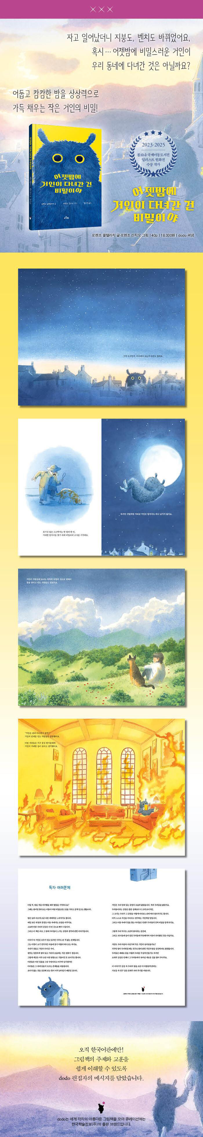 《어젯밤에 거인이 다녀간 건 비밀이야》 속 장면들은 우리가 세상을 바라보는 방식에 관해 묻는다. 눈앞에 보이는 것만이 전부는 아니라는 것과, 그 뒤에는 보이지 않는 무수한 이야기가 숨어 있다는 것까지…. 설명할 수 없는 일들을 단순히 우연이라고 여기기도 하겠지만, 보이지 않는 존재를 믿는 마음은 그 속에서 새로운 이야기를 발견하게끔 만들기도 한다. 이 책은 현실과 꿈의 경계에서 그 선택의 순간을 우리 앞에 가만히 놓아 둔다.