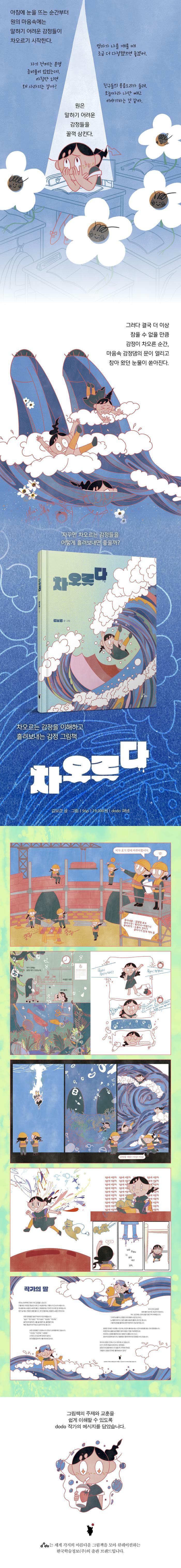 『차오르다』는 원의 하루를 따라가며, 마음속에 감정이 차오르는 과정을 섬세하게 담아냈다. 원은 가족과의 일상, 친구들과의 관계 속에서 서운함, 불안, 두려움 같은 감정을 느끼지만 쉽게 표현하지 못한다. 아이들이 느끼는 복잡한 감정의 변화를 물이 차오르는 이미지로 그려 내며, 다양한 방법으로 감정을 흘려보낼 수 있음을 보여 준다. 이를 통해 독자들이 자신의 마음을 이해하고, 스스로 다루는 방법을 생각해 보게 하는 그림책이다.
