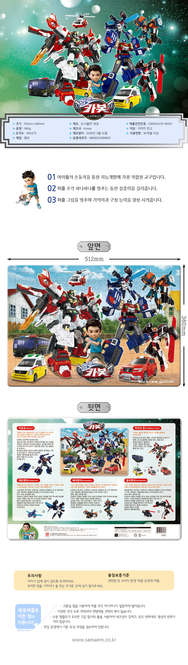 퍼즐 그림을 맞추며 집중력,기억력, 구성 능력 향상을 기대할 수 있다. 눈과 손의 협응력을 통한 소근육 발달 및 지능 개발에 도움을 줄 수 있다. 퍼즐 뒷면에는 시즌 17에 등장하는 주요 카봇의 특징이 담겨 있다.