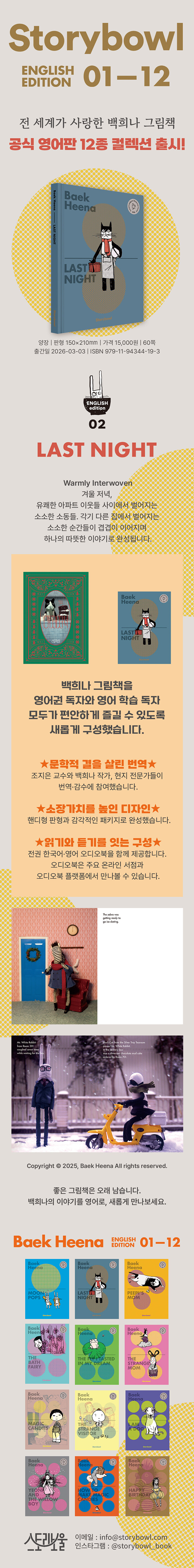 #영어·한국어 오디오북 동시 감상 가능백희나 그림책 《어제저녁》 영문판으로, 유쾌한 아파트 이웃들의 소소한 하루가 겹겹이 이어지는 따뜻한 이야기.
