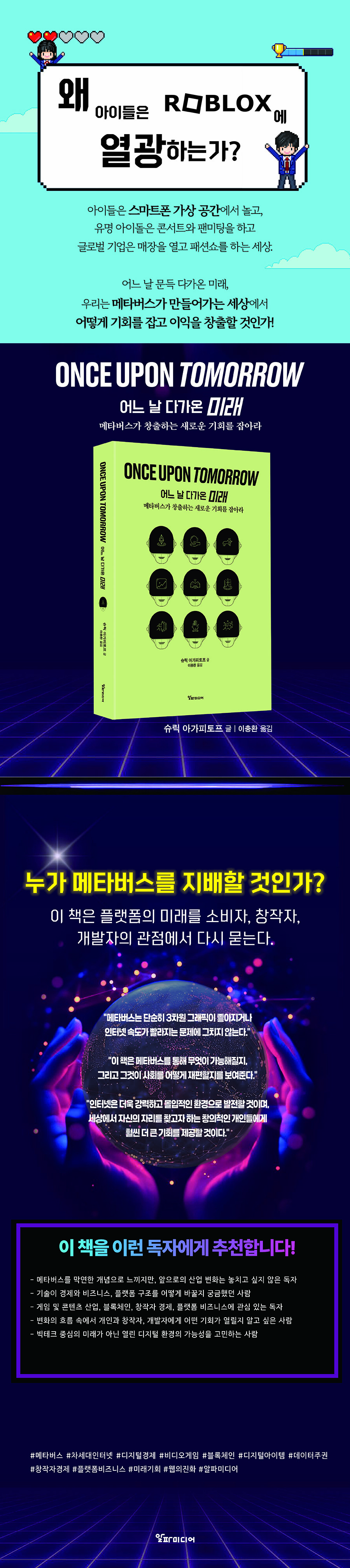 메타버스를 둘러싼 담론은 여전히 막연하고 과장돼 보이기 쉽다. 그러나 『ONCE UPON TOMORROW 어느 날 다가온 미래』는 메타버스를 단순한 유행어가 아니라, 인터넷 이후 가장 거대한 구조 변화로 읽어낸다. 이 책은 메타버스를 사람들이 일하고, 놀고, 거래하고, 이야기를 만들고, 가치를 주고받는 방식 전체를 바꾸는 차세대 인터넷의 전환점으로 설명한다.