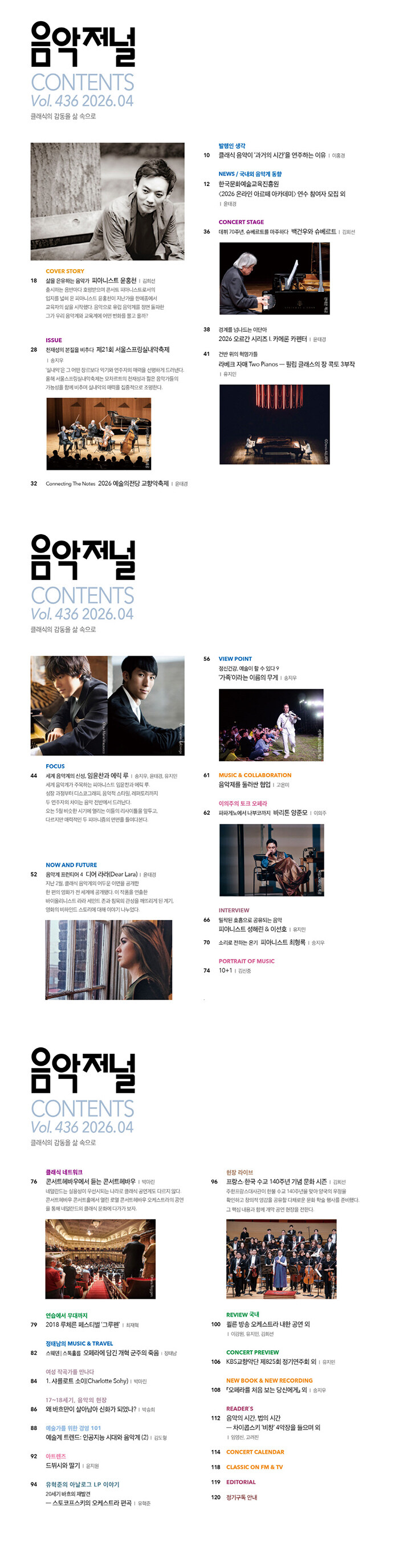 월간《음악저널》은 1989년 창간된 국내 대표 클래식 음악 전문지로, ‘음악계의 모든 현장을 공정하고 진실하게 기록한다’는 사명 아래 클래식 음악계의 소통과 성장을 위해 정직한 기록자의 역할을 꾸준히 이어왔다. 매월 국내외 음악계의 흐름을 정확하게 전달하며 심도 있는 인터뷰와 기획 기사, 깊이 있는 칼럼을 통해 균형 잡힌 시각과 신뢰할 수 있는 정보를 제공하고 있다. 입문자부터 애호가, 음악도와 전문 연주자, 예술계 종사자 및 후원자까지 폭넓은 독자를 아우르며 전문성과 독창성을 갖춘 콘텐츠를 담고 있을 뿐 아니라, 클래식 음악을 중심으로 다가오는 시대의 문화예술 전반을 이끌어가는 동반자로 자리매김하고 있다.