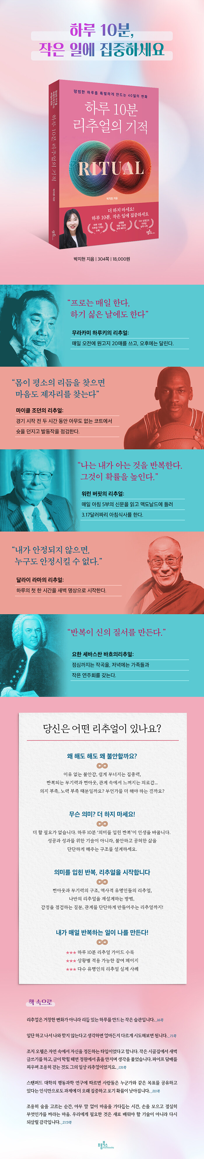 흔들리는 삶을 지켜주는 10분역사 속 인물들과 현존하는 유명인들의 리추얼도 스토리로 풀어낸다. 작가, 운동선수, 경영 대가, 정신적 리더, 과학자, 음악가, 화가, 영화인 등이 실천했던 다양한 리추얼을 소개하고, 그 리추얼이 어떻게 평범한 인간을 위대한 인물도 성장시켰는지 보여준다. 나아가 저자는 독자가 단순히 이해하는 데서 그치지 않고 실제로 변화를 경험할 수 있도록 돕는 다양한 참여 페이지를 제공한다. 체크리스트 등을 통해 자의 상태를 점검하고 변화를 추적할 수 있게 했다.