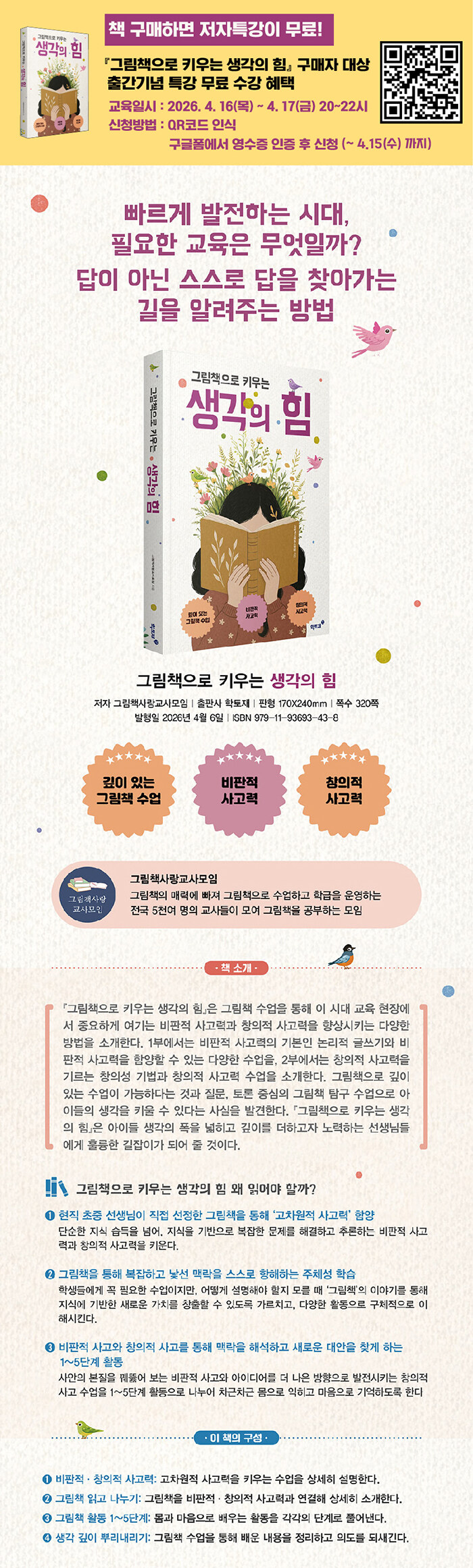 성장하는 주체적 학습자를 위한 그림책 생각 수업. 그림책은 정답이 하나로 정해져 있지 않은 질문을 자연스럽게 만들어 낸다. 같은 장면을 보고도 서로 다르게 해석할 수 있기 때문에, 학생들은 친구들과 서로의 생각을 나누며 사고의 폭을 넓힌다. 이는 비판적 사고와 의사소통 능력이 향상되는 중요한 계기가 된다. 또한 그림책은 학생들의 구체적 삶의 맥락에서 출발하는 이야기를 통해 수업 몰입도를 높이고, 자연스럽게 깊이 있는 생각으로 나아가게 한다.