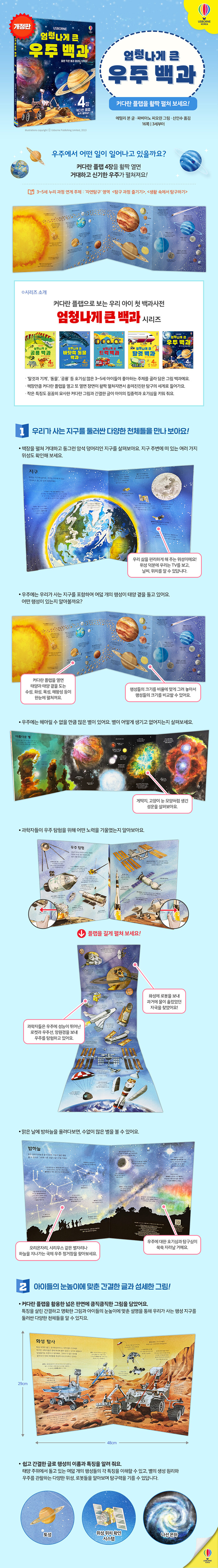 3~5세 아이들을 위한 커다란 플랩북 「엄청나게 큰 백과」 시리즈의 우주 편이다. 책장만큼 커다란 플랩을 열면 태양과 여덟 행성, 지구와 위성이 한눈에 펼쳐진다. 그림 백과 형식으로 아이들이 특히 궁금해하는 우주의 모습을 담았다.
