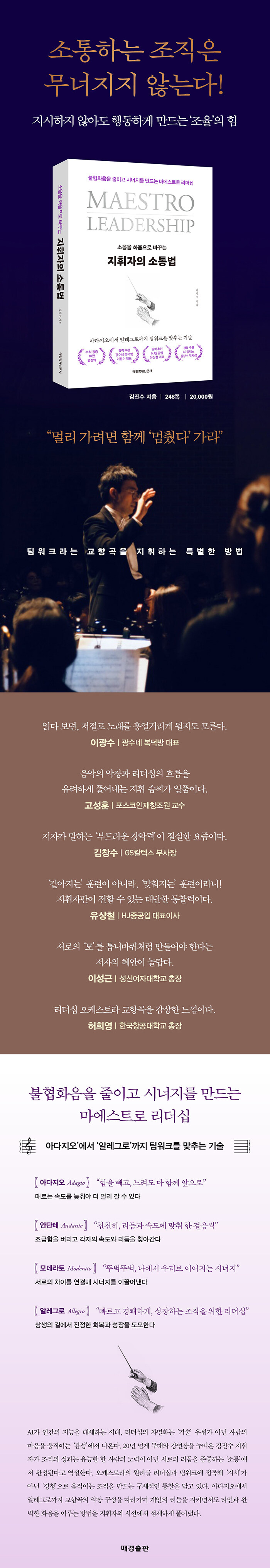 서곡 ‘Prelude’를 시작으로 제1악장 ‘아다지오’, 제2악장 ‘안단테’, 제3악장 ‘모데라토’, 제4악장 ‘알레그로’, 그리고 ‘피날레’까지 교향곡의 구성에 맞춰 전개한다. 각 장은 힘을 빼는 법, 각자의 리듬을 찾는 과정, 차이를 연결하는 방식, 빠른 실행과 성장 전략을 다루며 개인의 자율성과 조직의 구조를 함께 조율하는 방법을 제안한다.