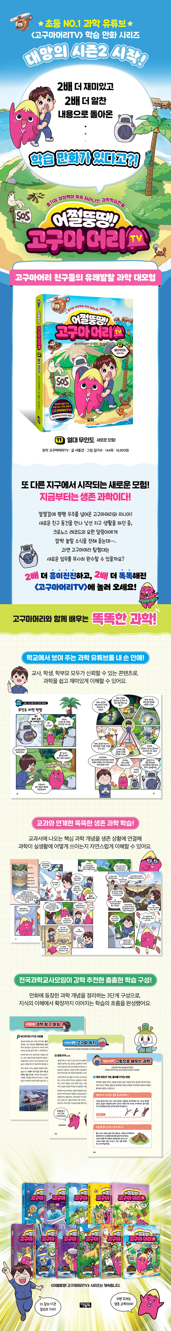 과학 개념을 깊이 있게 다루는 시즌 2의 설계! 평행 우주를 배경으로 새로운 이야기가 펼쳐지는 시즌 2에서는 학습 구성 또한 한층 강화되었습니다. 만화 본문에 등장한 과학 개념 가운데 핵심 내용은 ‘어쩔뚱땡! 과학 탐구 파일’을 통해 정리하고, 어려운 과학 용어는 ‘지식이 쑥쑥! 고구마위키’에서 보다 체계적으로 설명합니다. 여기에 복잡한 과학 원리를 그림과 도식으로 직관적으로 제시한 ‘한눈에 쏙쏙! 그림으로 보는 과학’ 페이지를 더해, 이해와 복습, 확장으로 이어지는 학습 구성을 완성했습니다. 이야기의 재미와 학습의 깊이를 동시에 담아낸 11권은 시즌 2의 변화를 가장 선명하게 보여 주는 권으로, 더욱 알차고 완성도 높은 구성으로 독자들을 만나게 됩니다.