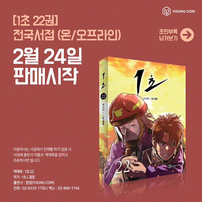 인재가 만들어낸 불씨, 재해가 되어 되돌아오다!<죽음에 관하여>, <네가 없는 세상>, <아이덴티티>의 시니 작가와 <헤어스탕스> 광운 작가가 만나 소방관들의 삶을 그린 <1초>로 우리들 곁에 돌아왔다. 시니 작가의 소방 공익근무 경험, 소방청과 소방학교 답사, 끊임없는 취재와 인터뷰를 통한 현장감 넘치는 작품이 탄생하면서 현직 소방관을 비롯한 많은 대중들에게 사랑받고 있다.