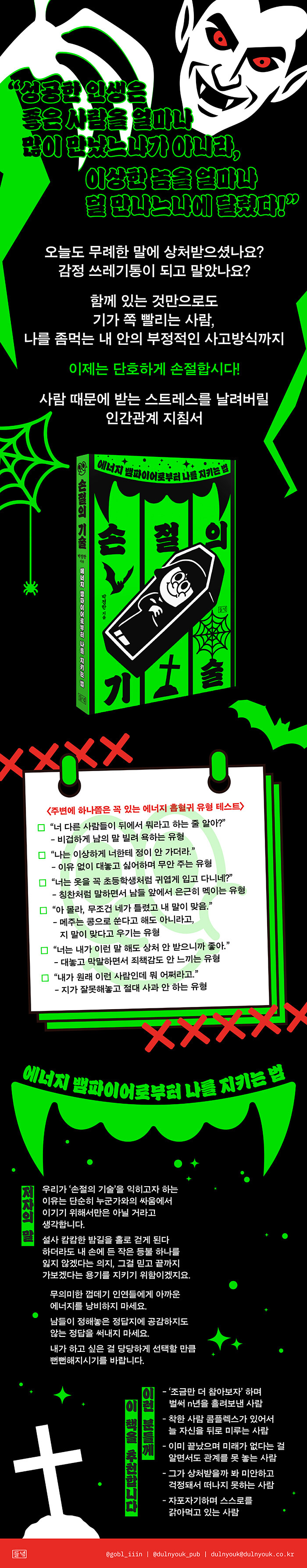이상한 놈을 얼마나 덜 만나느냐에 달렸다”사람 때문에 받는 스트레스를 날려버릴 인간관계 지침서 『손절의 기술』『왜 아가리로만 할까?』 박정한 작가의 신작 『손절의 기술: 에너지 뱀파이어로부터 나를 지키는 법』이 출간되었다. 이 시대 청년들의 현실과 그 안에서 경험하는 좌절을 다각도로 그려내며 그럼에도 불구하고 절대 포기하지 않겠다는 투지를 빛내 주목받았던 전작에 이어, 이번에는 나를 지키기 위해 내 기력을 소모하고 스트레스를 주는 인간관계와 스스로를 좀먹는 부정적인 사고방식과 단호히 단절하는 삶의 기술을 이야기한다.
