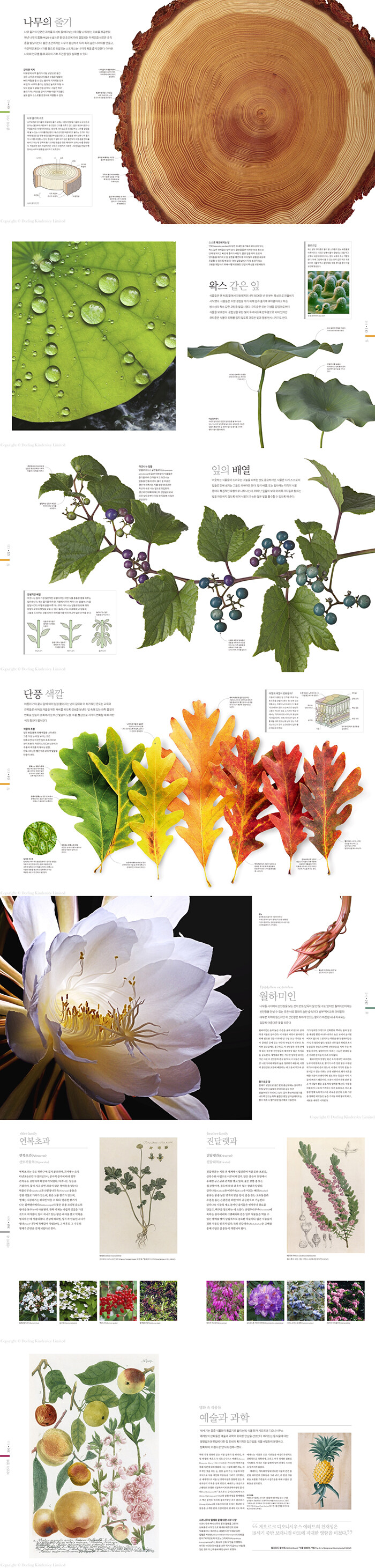 잎 || 잎의 형태 110 | 잎의 구조 112 | 복엽 114 | 명화 속 식물들: 자연이 설계하다 116 | 잎의 성장 118 | 펴지는 잎을 가진 양치류 120 | 잎의 배열 122 | 명화 속 식물들: 식물학의 다른 모습 124 | 잎과 물의 순환 126 | 잎과 빛 128 | 잎의 크기 130 | 잎의 모양 132 | 뾰족한 잎끝 134 | 잎 가장자리 136 | 털이 많은 잎 138 | 명화 속 식물들: 고대 약초 의학서 140 | 다육 식물의 잎 142 | 왁스 같은 잎 144 | 화살통나무 146 | 은색의 잎들 148 | 무늬가 들어간 잎 150 | 단풍나무 152 | 단풍 색깔 154 | 쏘는 잎 156 | 바켈리아 카루 158 | 잎의 방어 160 | 극한 조건에 맞서는 잎 162 | 비스마르크야자 164 | 떠 있는 잎들 166 | 웅덩이가 있는 식물 168 | 잡아먹는 잎 170 | 끈끈이주걱류 172 | 재생하는 잎 174 | 보호용 포엽 176 | 포엽의 종류 178 | 잎과 엽침 180