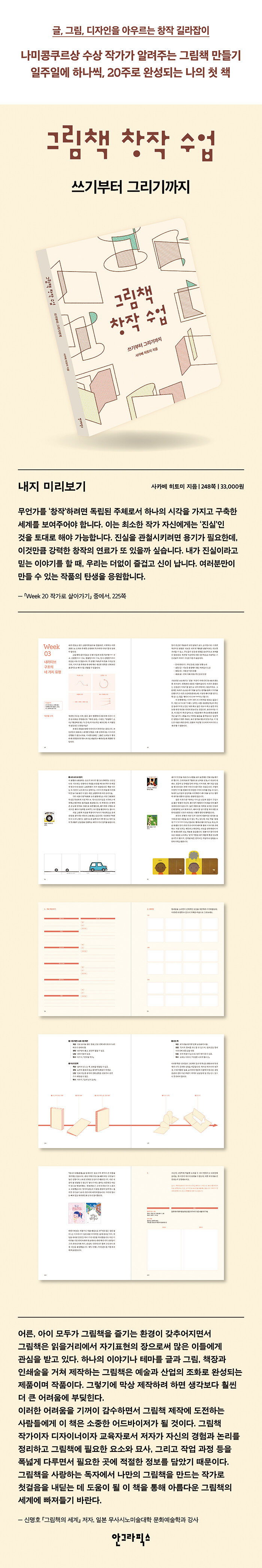 매주 한 챕터씩 20주로 완성하는 나만의 첫 그림책『그림책 창작 수업』에서는 그림책 창작자를 위한 기본 지식을 체계적으로 배우고 이를 워크북 페이지로 실습해보며 창작 기법을 익혀본다. 오랫동안 학생들에게 그림책을 가르친 저자와 함께, 그림책 정의와 종류를 시작으로 내러티브 구조, 스토리텔링 원칙, 에피소드 구성, 캐릭터 개발, 장면 계획 및 연출을 차근차근 살펴보며 하나의 이야기가 담긴 그림책을 구현하는 법을 알아갈 수 있다. 또 그림책의 표지 문법, 제작 방식, 물리적 조건 등을 이해하면서 물성으로 그림책을 완성하는 법까지 파악할 수 있다. 그림책의 내용과 형태를 탐구한 뒤에는 국내외 그림책상과 수상 제도를 비롯해 실제 출판사와 연락하고 그림책을 출간하는 단계를 살펴본다. 그림책 작가가 되는 데 구체적인 방향을 정하고 실제 현장을 바탕으로 한 조언을 접하며, 실제로 출판사의 문을 두드릴 수 있도록 용기를 준다.