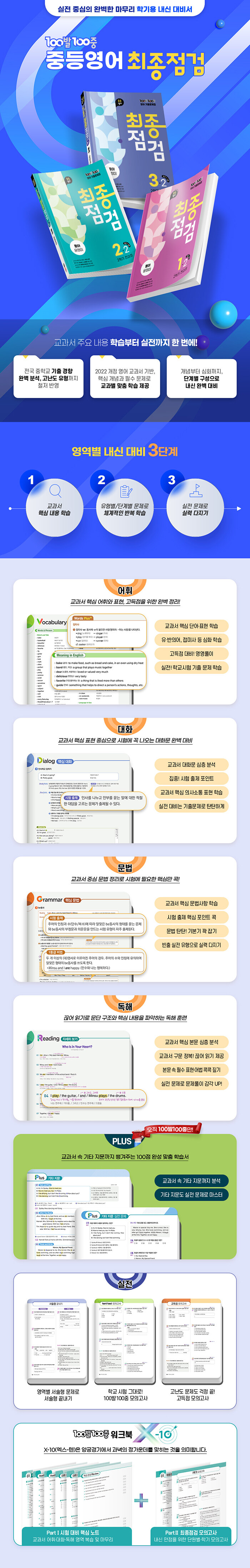 어휘, 대화, 문법, 독해 영역별로 다양한 유형의 서술형 문제를 풀어봄으로써 학교 시험에서 비중이 확대되고 있는 서술형 평가에 완벽히 대비할 수 있도록 함