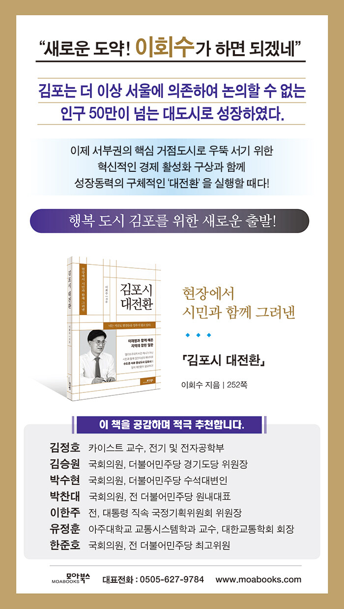 이제 더 빨리 ‘함께 만드는 세상’을 위해 김포시를 새롭게 설계해야 할 때라는 김포미래비전포럼 이회수 상임대표는 미래 구상을 4개의 장으로 갈무리해 저술한 것이다. 저술이라고 해서 책상 앞에 앉아서 쓴 탁상공론이 아니라 발로 뛰어다니며 현장의 생생한 목소리를 담은 김포 시민의 정책과 생활상이다.