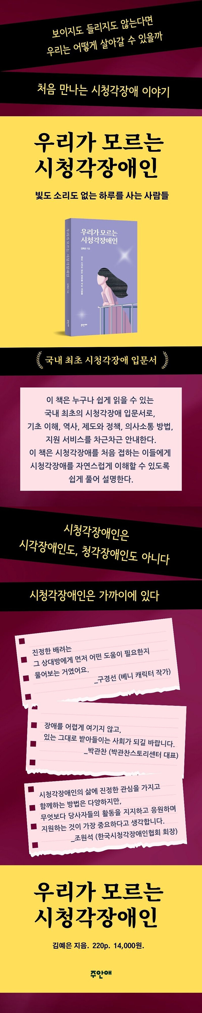 이 책은 이러한 사회적 공백을 메우며 시청각장애를 처음 접하는 이들이 기초부터 쉽게 이해할 수 있도록 차근차근 안내한다.