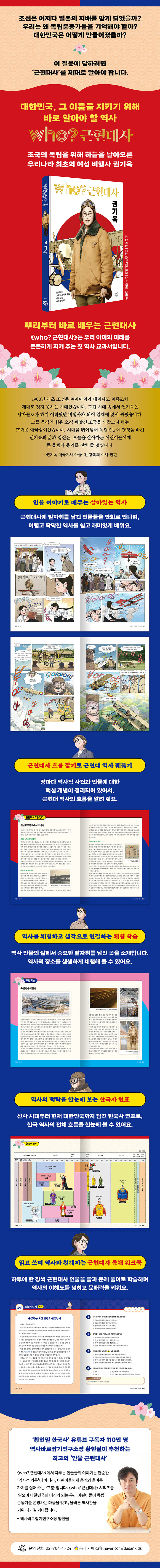 인물로 배우는 최고의 역사 교과서 who? 시리즈로 만나다!오늘날 우리 사회는 역사적 사실에 대한 왜곡과 갈등이 계속되고 있습니다. 어떤 사건은 축소되고, 어떤 인물은 왜곡되며, 대한민국의 정체성과 성립 배경조차 논란의 대상이 되기도 합니다. 최근 벌어지는 정치적 대립 역시 이와 무관하지 않습니다. 이처럼 역사를 둘러싼 갈등이 지금까지도 이어지는 지금, 우리 아이들이 올바른 역사 인식을 갖추는 것이 꼭 필요합니다. 근현대사는 지금 우리가 살고 있는 대한민국을 만든 과정을 새긴 기록입니다. 조선 말 개혁의 열망부터, 일제강점기 독립운동의 희생, 해방 이후의 분단과 민주화까지 한국 근현대사에 있었던 굵직한 사건들을 역사 인물의 삶을 통해 더욱 생생하고 흥미롭게 배울 수 있습니다.
