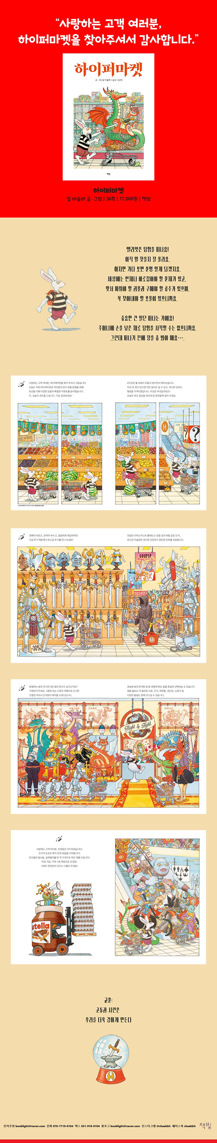 오늘도 하이퍼마켓을 찾아주셔서 감사합니다.”프랑스를 대표하는 그림책 작가 질 바슐레가 현실과 상상의 경계를 넘나드는 유쾌한 영웅 서사로 돌아왔다. 제목 ‘하이퍼마켓’은 유럽에서 발전한 대형 슈퍼마켓과 백화점의 기능을 결합한 형태의 초대형 쇼핑 공간으로 우리나라의 초대형 마트에 해당한다. 어느 날 주인공 엘리엇은 홀로 탐험을 떠난다. 그러나 탐험의 시작은 숲이나 성이 아닌, 바로 하이퍼마켓이다. 하이퍼마켓에 들어서자, 매장 곳곳에서 흘러나오는 달콤한 안내 방송은 끊임없이 엘리엇의 소비 욕망을 자극하고, 장엄해야 할 탐험 서사는 소비 행위로 대체된다. 질 바슐레 작가는 판타지 서사를 아이들에게 익숙한 쇼핑 공간으로 끌어들여, 새로운 상상의 세계를 열어주며 상상력조차 소비의 대상이 되어버린 현대 사회의 풍경을 유머러스하게 풍자한다. 신나는 탐험의 무대가 된 하이퍼마켓은 게임처럼 과장된 공간과 넘쳐나는 물건들, 상상력을 자극하는 요소들로 가득한 마법의 세계로 변신한다. 질 바슐레 작가 특유의 세밀한 묘사와 위트 넘치는 디테일은 관찰과 발견의 즐거움을 선물한다. 각종 무기를 판매하는 무기매장에서는 영국 아서왕의 전설적인 검 엑스칼리버, 프랑스 중세 서사시 ‘롤랑의 노래’에 등장하는 전설적인 검 뒤랑달과 스위스 아미 나이프 창도 장바구니에 담을 수 있고, 용과의 모험을 예약할 수 있는 여행사에서는 타라스크, 와이번, 히포그리프, 그리프 등 전설 속에 나오는 상상의 존재들도 장바구니에 담을 수 있는 상품이 된다. 하이퍼마켓의 마력에 푹 빠져 혼돈에 휘말리는 트롤과 고블린, ‘반지의 제왕’의 간달프 등 다양한 판타지 세계의 주인공들도 등장해 재미를 더한다.