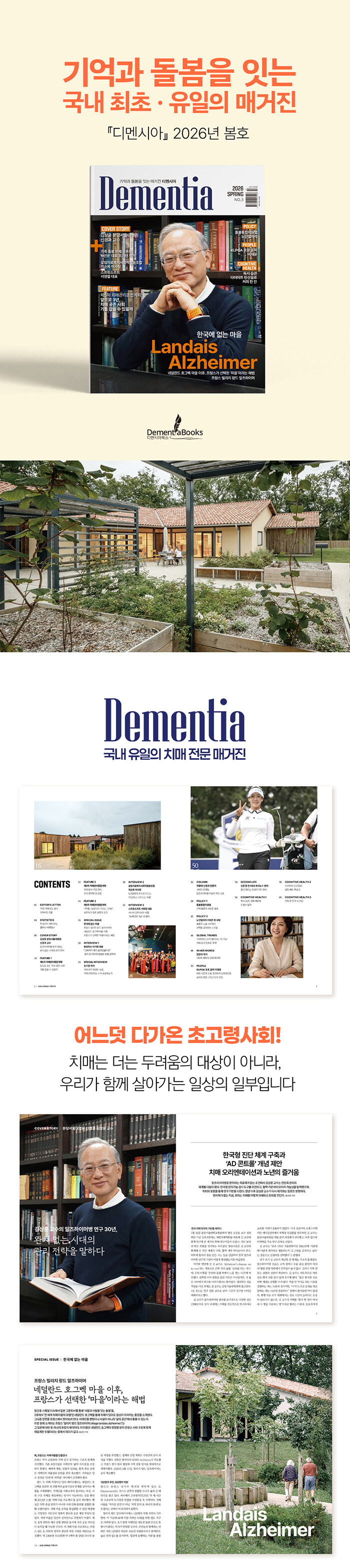 치매 전문 출판사 디멘시아북스가 국내 최초의 치매 전문 계간지《Dementia》2026년 봄호(통권 3호)를 발행했습니다. 이번 호는 '치매가 있어도 존엄을 지키며 살 수 있는 사회'를 만들기 위한 국가적 청사진인 '제5차 치매관리종합계획'과 '돌봄통합지원법'을 집중 분석하고, 해외 사례로 프랑스의 치매 마을 '빌리지 랑드 알츠하이머'를 소개하며 우리 공동체가 나아갈 방향을 제시합니다.
