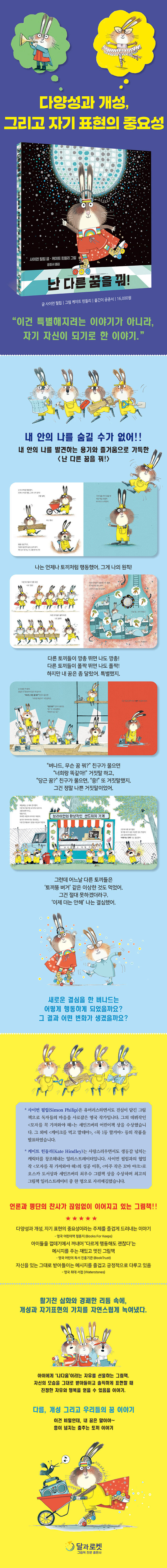 《난 다른 꿈을 꿔!》는 남들과 똑같지 않아도 괜찮다고, ‘나다운 나’로 살아갈 때 세상이 얼마나 신나고 반짝이는지 보여 주는, 용기와 자기다움을 응원하는 유쾌한 그림책입니다. 이것은 특별해지려는 이야기가 아니라, 자기 자신이 되기로 한 이야기이며, 남들처럼이 아니라 나답게 서는 용기에 대한 이야기입니다.