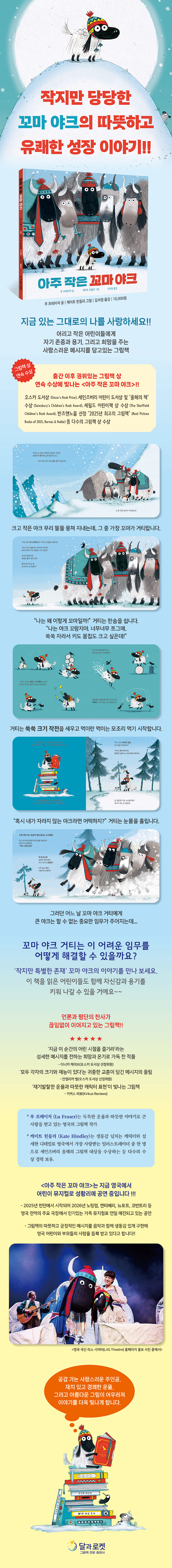 거티는 ‘쑥쑥 크기 작전’을 세웁니다. 채소도 골고루 먹고, 매일 운동도 하고, 책도 열심히 읽었다. 하지만 몸은 여전히 그대로이다. 그러던 어느 날, 다른 야크들이 위험하고도 대담한 일을 도와 달라며 거티를 찾아온다. 혹시 그 일이, 작은 야크만이 할 수 있는 일이라면 어떨까? 데뷔 작가 루 프레이저와 많은 사랑을 받아 온 일러스트레이터 케이트 힌들리가 전하는 이 작품은, 자기 자신을 있는 그대로 받아들이는 법을 유쾌하고 따뜻하게 들려준다. 개성과 자존감, 그리고 작고 어린 존재로 살아가는 기쁨을 섬세하게 담아낸 공감 가득한 이야기다.