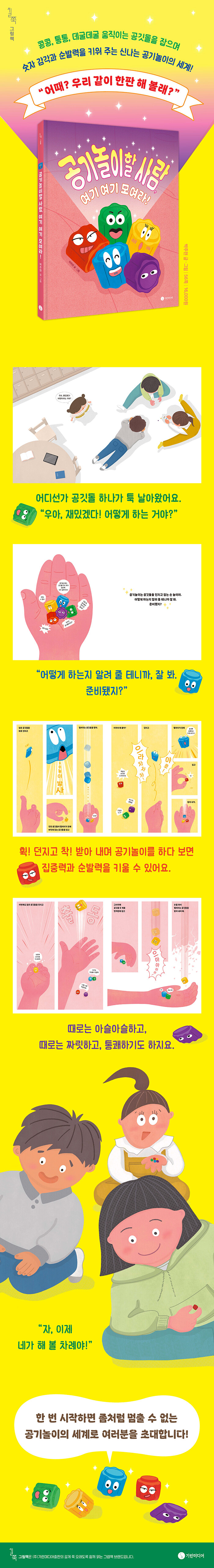 공기놀이의 규칙을 단계별로 보여 주며, 콩콩이, 쓱싹이, 데굴이, 통통이, 찰싹이 등 공깃돌 친구들과 함께하는 긴장감과 재미를 생생하게 전달한다. 반복하며 익숙해지는 과정 속에서 아이들은 자연스럽게 집중력과 순발력, 도전하는 마음을 배우게 된다.
